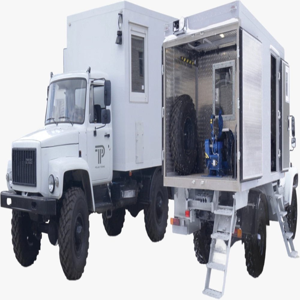 The device is installed on the chassis of various vehicles, it includes a winch with a control and control post, winch transmission, as well as a replacement control mechanism for the clutch and the rotation frequency of the car engine. Vertical cages for transporting research devices and instruments, a locksmith's bench with a vise, a wardrobe for working clothes and a heater are installed on the chassis of the car. In addition to the operator's seat, a small desk for registration is attached to the wall of the bathroom. On the wall of the bath (on the left on the way), a passage with a heating device is provided for the exit of the working wire.